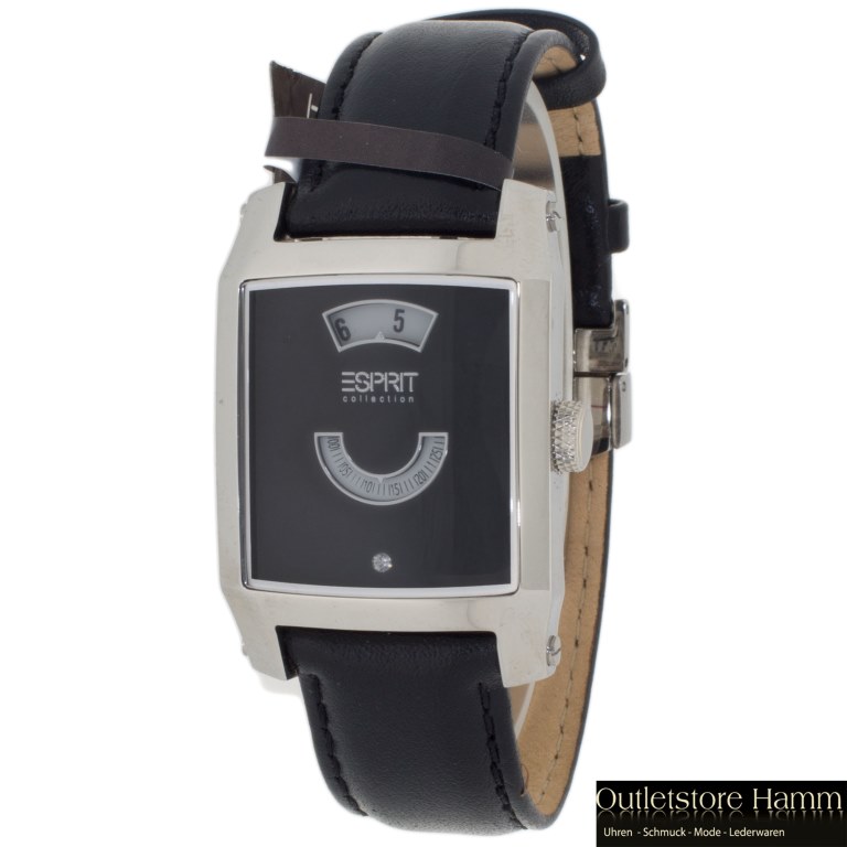 Zifferblatt: schwarz, mit silberfarbigem ESPRIT-Logo, ein glänzender Stein auf 6
