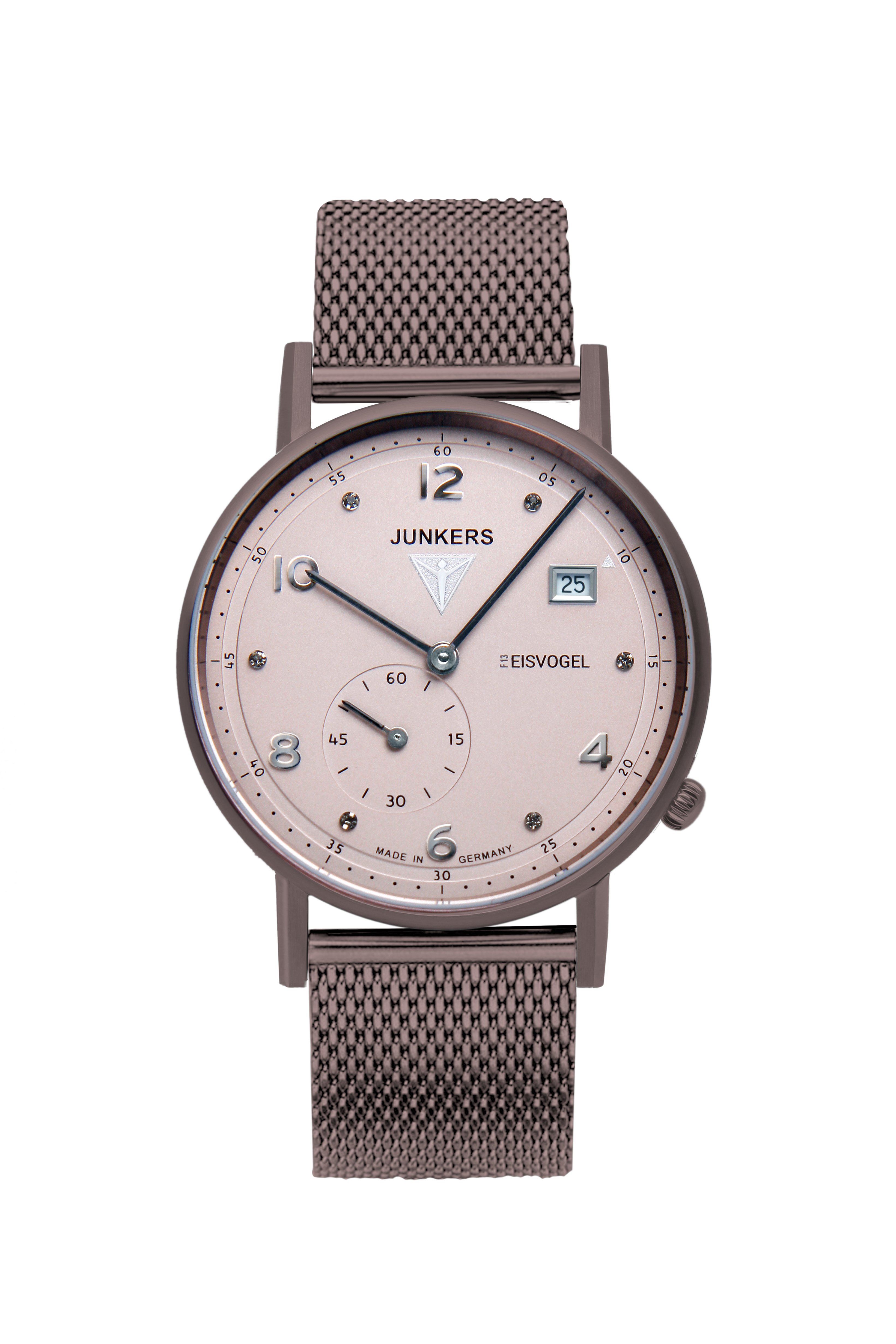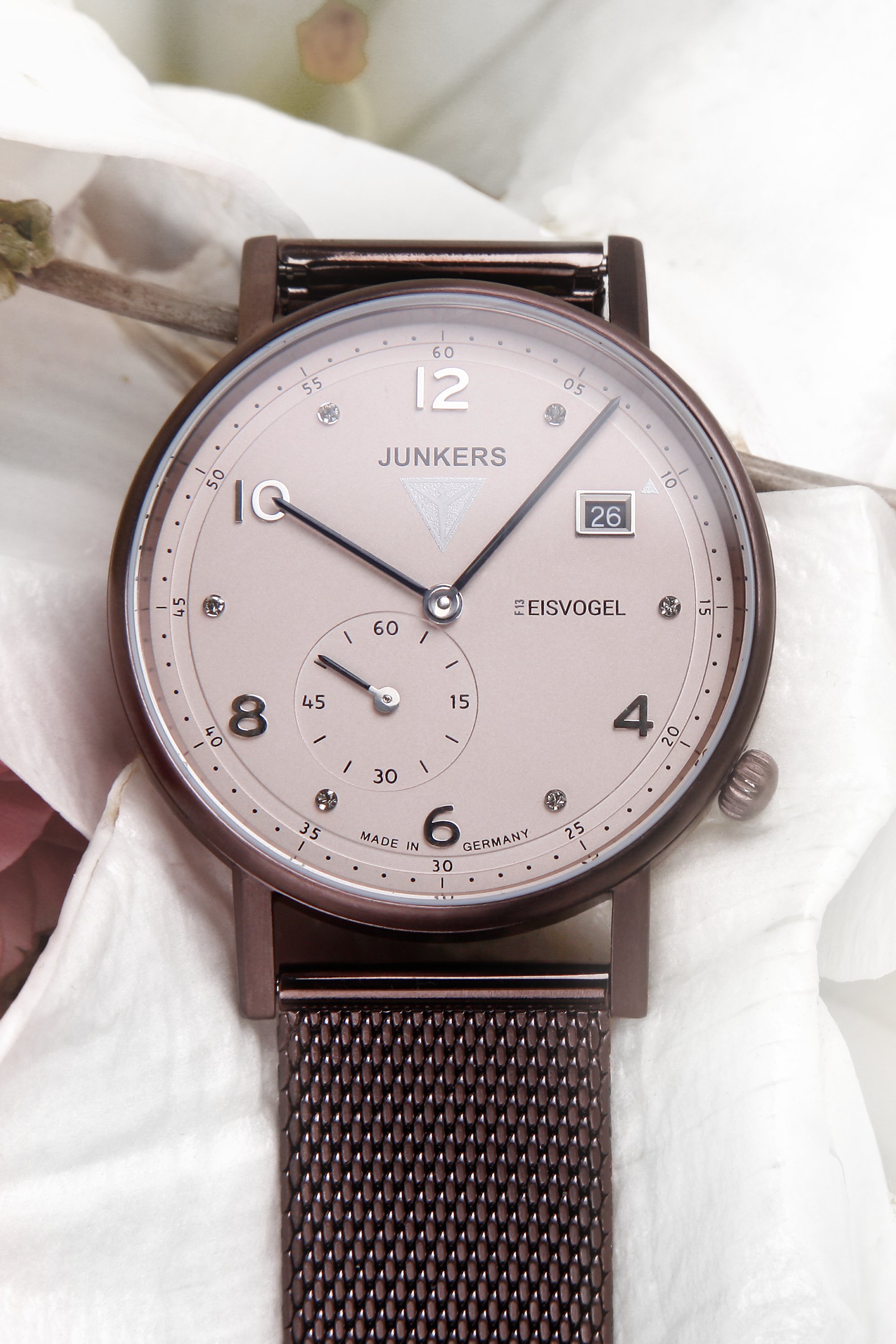Junkers - Serie Eisvogel F13 Lady - 6735M-4 Werk: Quarz Werk-Kaliber: Ronda 6004.D Gehäusedurchmesser: ca. 36mm Gehäusefarbe: braun Gehäuseform: Rund Gehäusehöhe: ca. 7mm Gehäusematerial: Edelstahl Gehäuseboden: Edelstahl Zifferblattfarbe: grau braun Uhrenglas: Mineralglas Wassergeschützt: 5 ATM Armbandmaterial: Edelstahl, Milanaise-Band Stegbreite: 18mm max. Armumfang: ca. 21cm Armbandfarbe: metallic grau braun Verschluß: Faltschließe Funktionen: Stunde, Minute, kleine Sekunde, Datum Sonstige Merkmale: Indizes mit 6 Kristallen, hergestellt von Swarovski