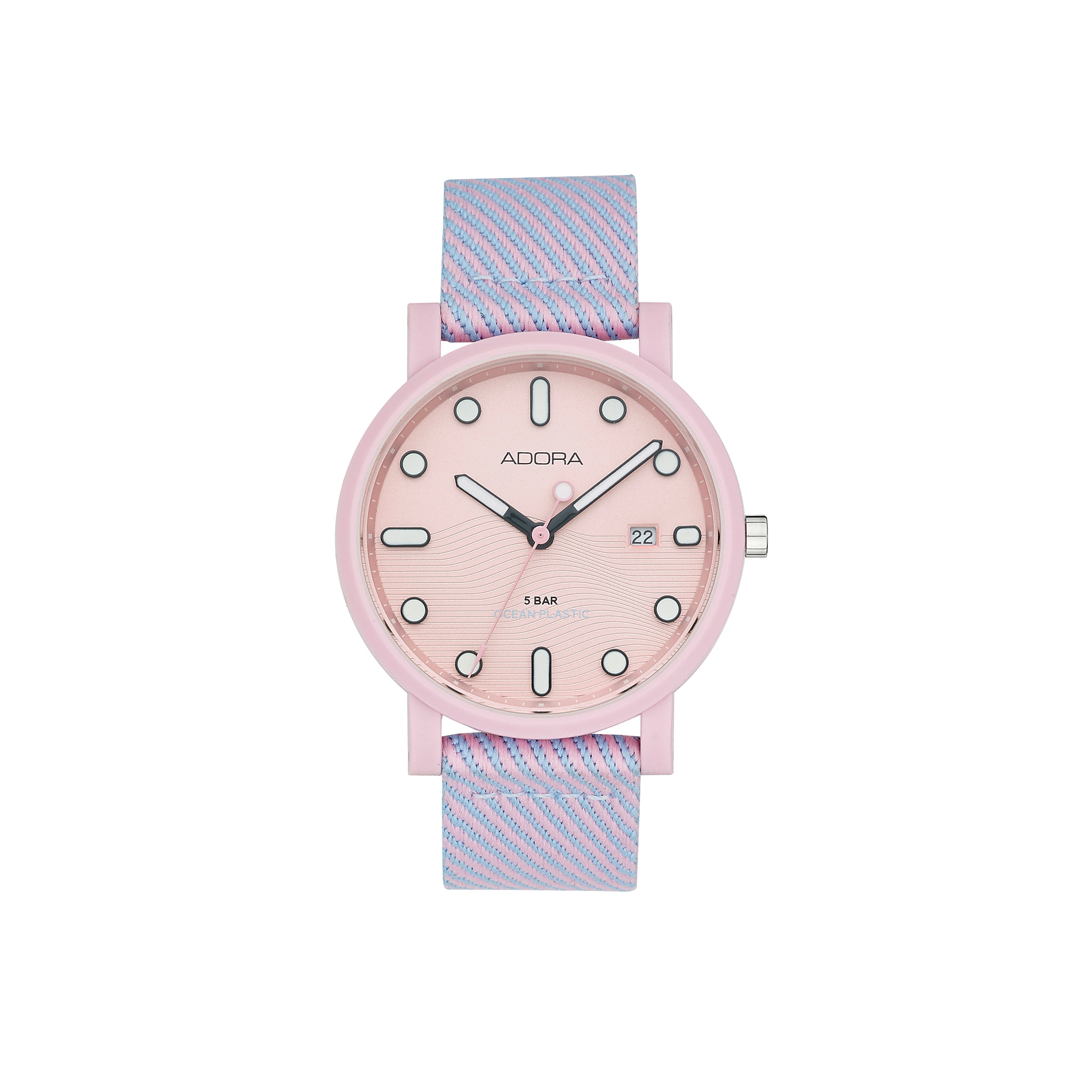 Adora OC2002 Damen Quarzuhr aus zertifiziertem Ozean-Plastik mit Nylonarmband, Mineralglas und 5 Bar Wasserdichtigkeit – nachhaltig und stilvoll.