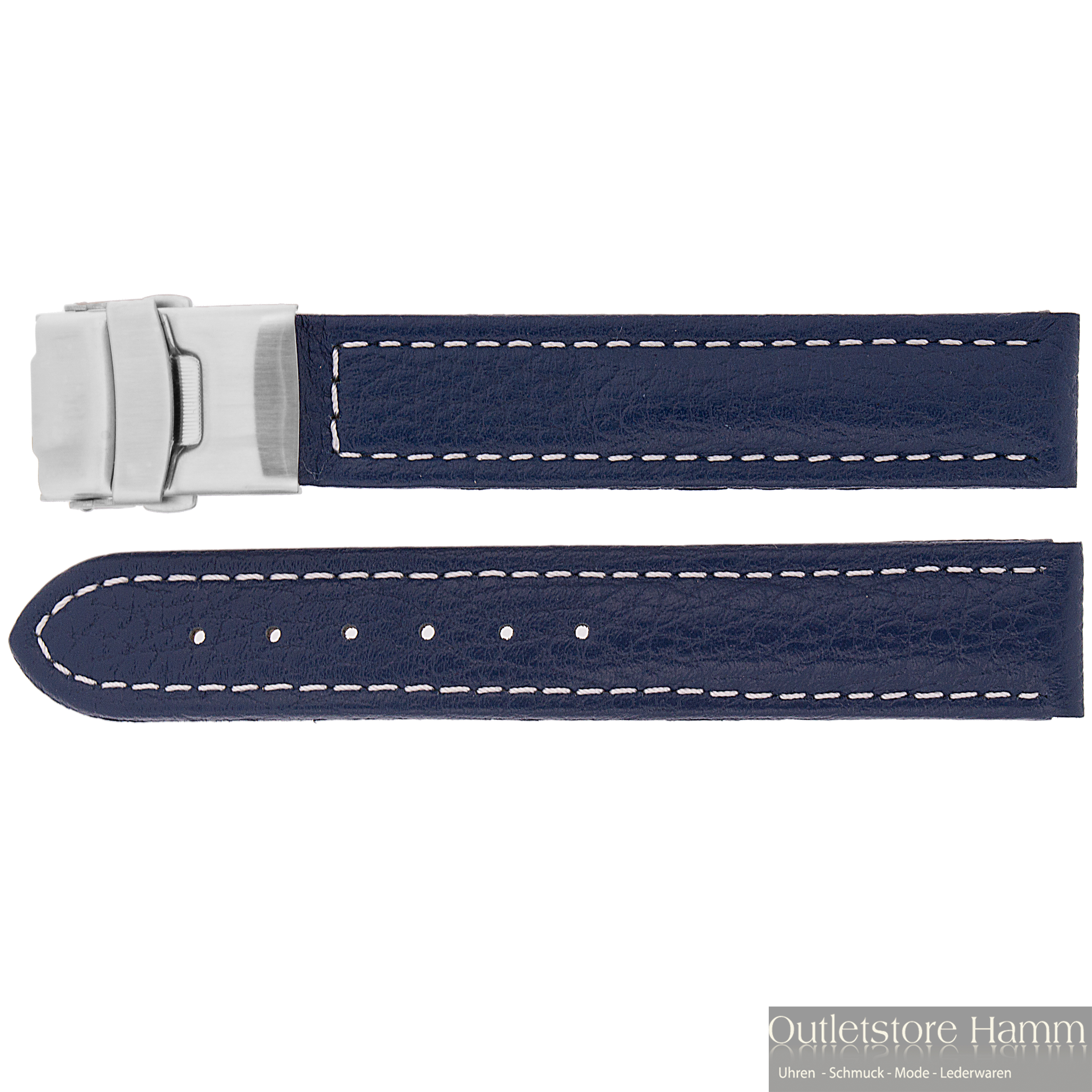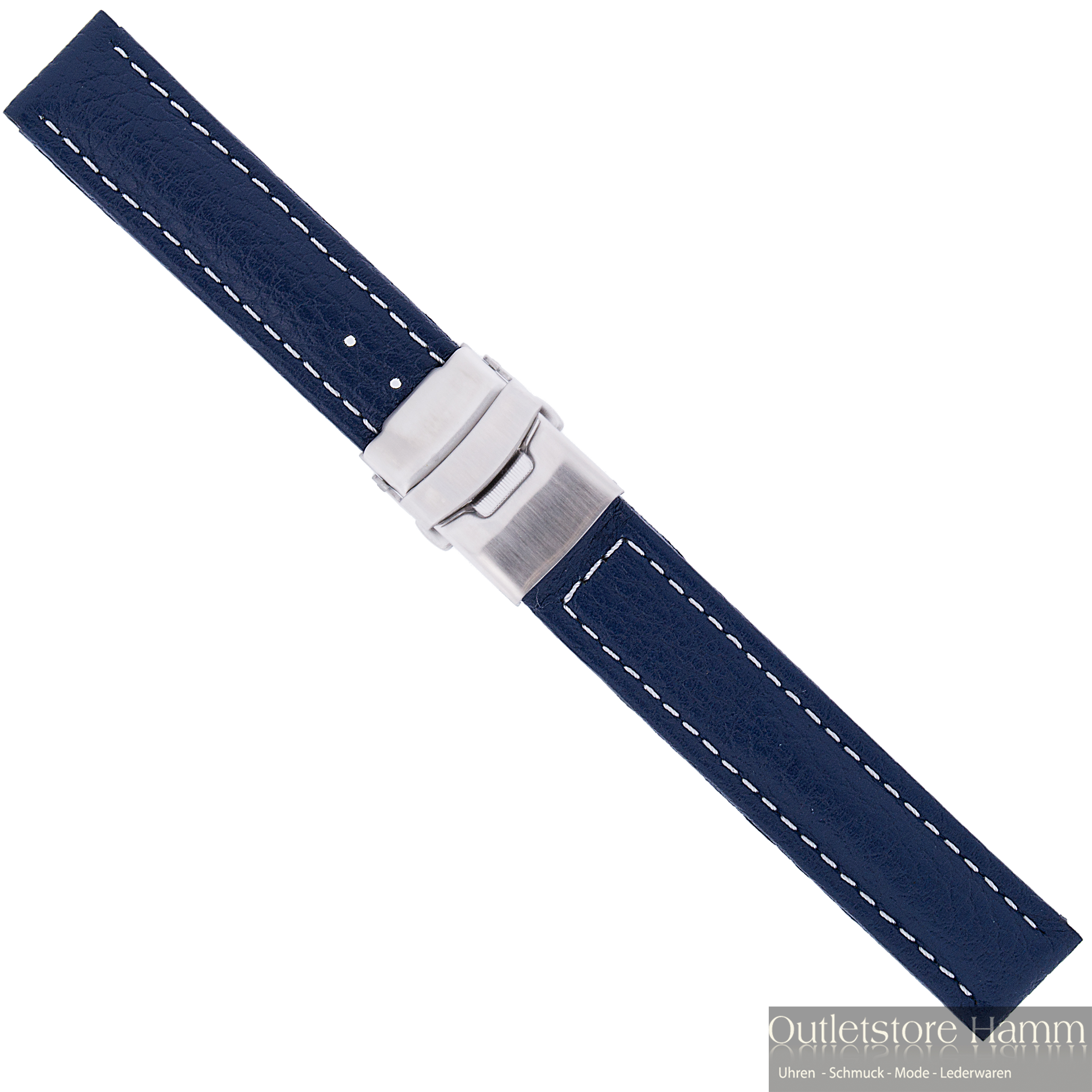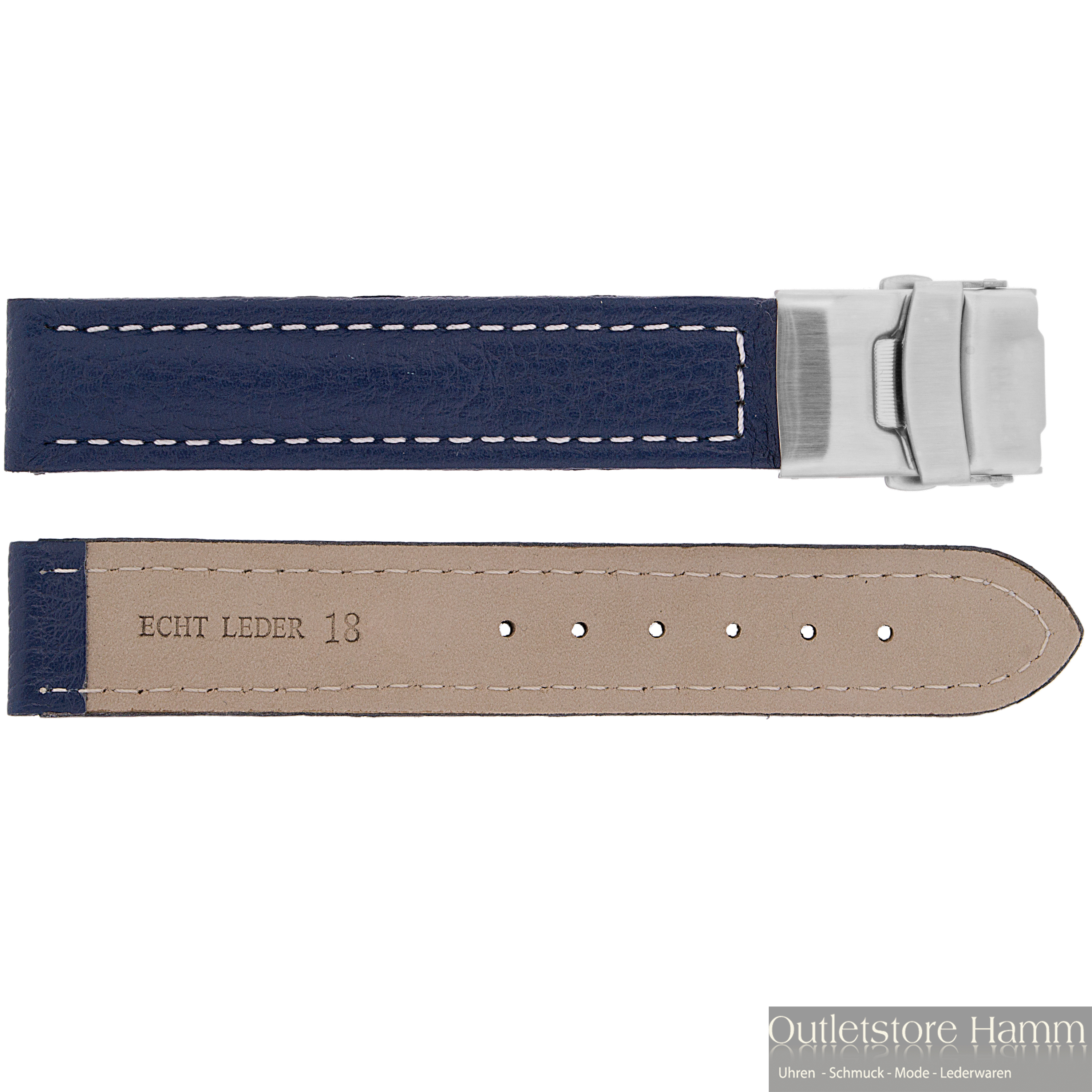 Schließenanstoß: 18mm Armbandfarbe: blau Prägung: genarbt Naht: weiß Schließe: Sicherheits-Faltschließe aus Edelstahl